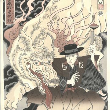 本図は「ダイアモンド・ドッグズ」に映る躍動的な犬を狐に見立て、九尾(きゅうび)の狐の伝説を題材とした演目で、曲独楽(きょくごま)の芸を披露する藤次を演じるボウイを描いています。