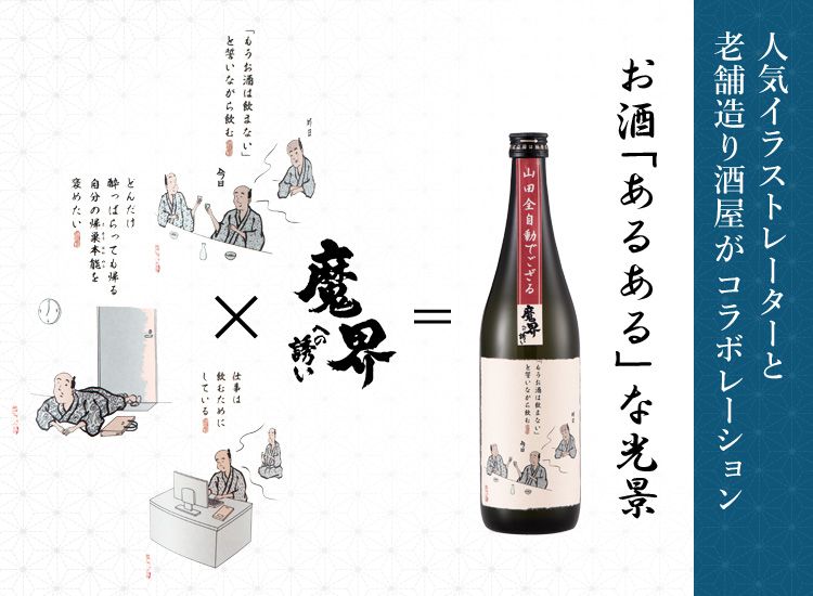 ロングセラーの「黒麹芋焼酎 魔界への誘い(720ml)」・「手造り純米酒 光武(720ml)」・「肥前浜宿 梅酒(720ml)」の3商品で山田全自動さんのコラボレーションデザインボトルを展開。