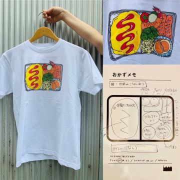 オリジナルデザインでつくるお弁当Tシャツ/トートバッグとは、予め用意されている具材から自分の好きなおかずを選んで組合わあせて、自分だけのお弁当デザインをTシャツやトートバッグにできるサービス。手順はまず、Tシャツ、トートバッグ、サコッシュから欲しいプロダクトを選びます。次にお弁当箱の形を選び、最後におかずを選びます。タイトルを入れることも可能です。
