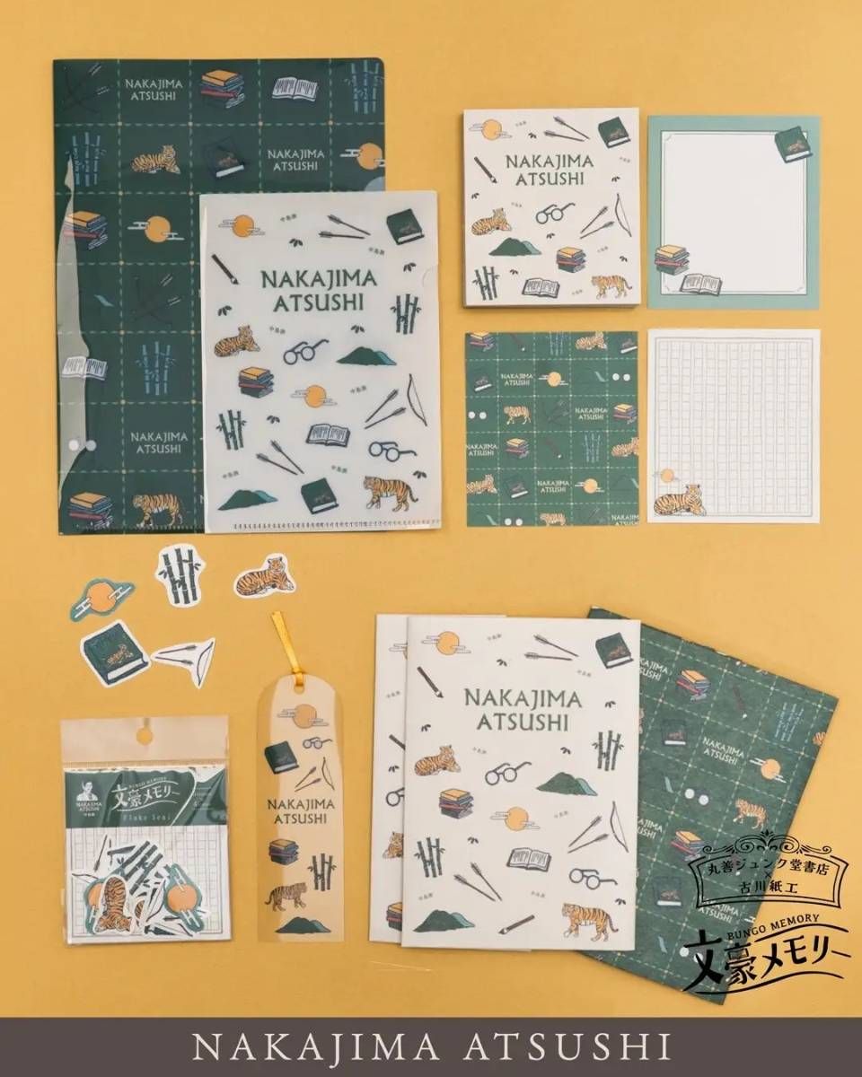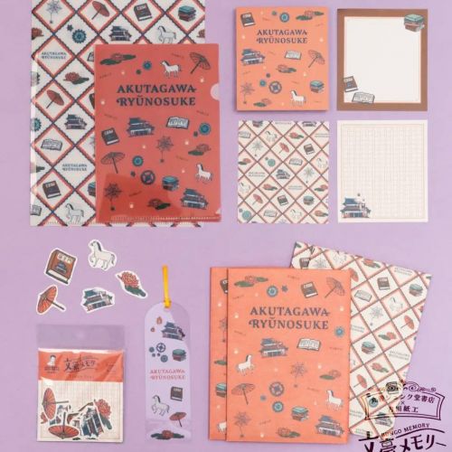 第1弾として、マルチクロス、A5クリアファイル、付箋、メモパッド、フレークシール、クリアブックマーカー、美濃和紙ブックカバーの7アイテムを、それぞれ梶井基次郎、太宰治、谷崎潤一郎、中原中也という文豪4人の作品をモチーフにしたデザインで発売。