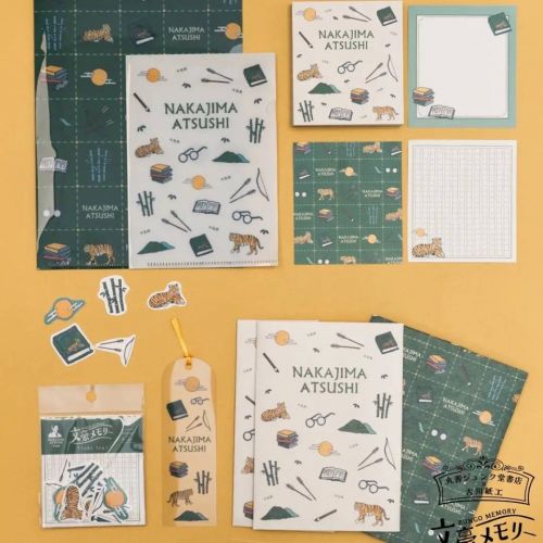 第2弾では、宮沢賢治、芥川龍之介、江戸川乱歩、中島敦という文豪4人の作品をモチーフにしたデザインの5アイテムが登場。ラインナップは、A5/A6クリアファイルセット、メモパッド、フレークシール、クリアブックマーカー、美濃和紙ブックカバー。
