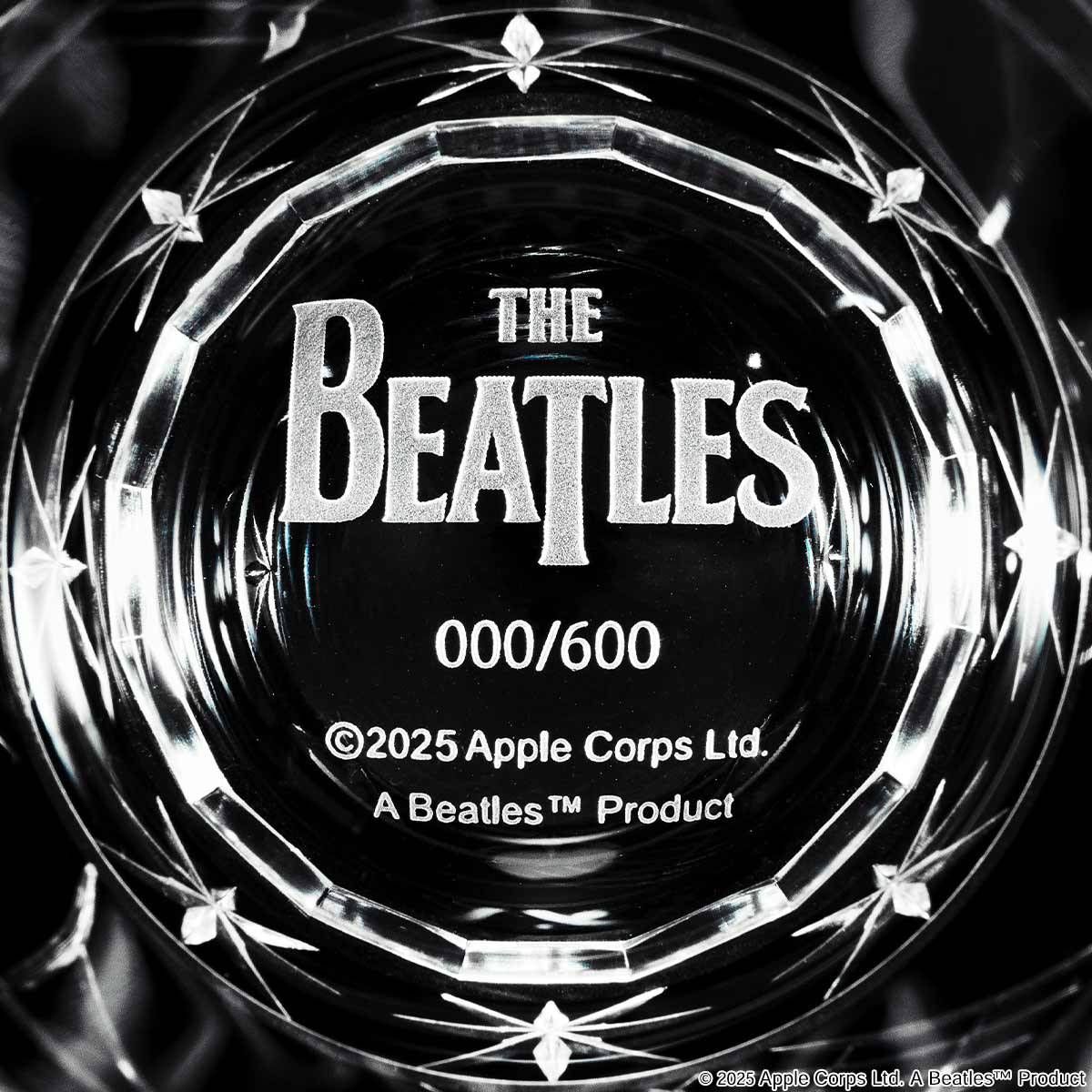 漆黒の色被せガラスに、アビイ・ロードの横断歩道を渡るメンバーのシルエットや楽器のモチーフ、英国のレンガの街並みをイメージした市松模様などが、伝統技法を用いて表現されています。