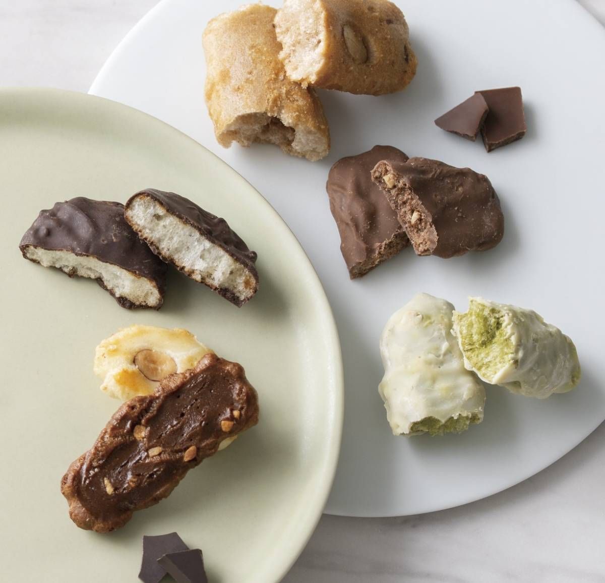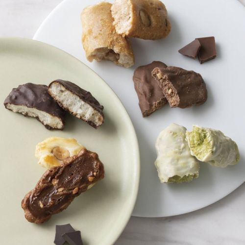 1袋には、まろやかなミルクチョコレートの甘みが引き立つ「ミルクチョコレートあられ」、深みのあるダークチョコレートが香ばしい醤油コーティングを引き立てる「ダークチョコレートせんべい」、抹茶とホワイトチョコレートのマリアージュが溶け合う「抹茶あられ」、そしてアーモンドや醤油の香ばしさを生かした「ココアあられ」、黒豆や黒糖などの香り豊かなあられの全6種類が入っています。