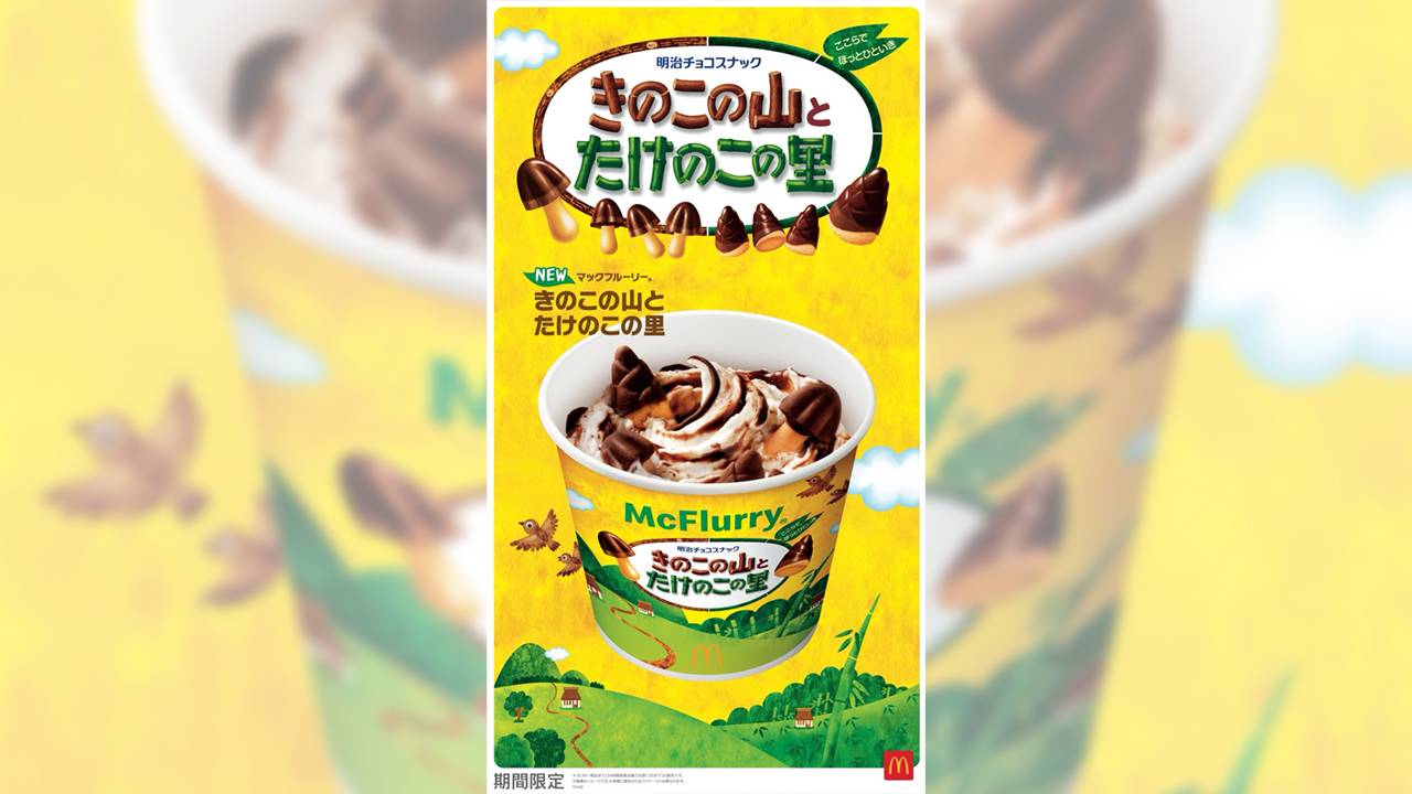 、人気チョコレート菓子「きのこの山」と「たけのこの里」を使用したマクドナルドの「マックフルーリー きのこの山とたけのこの里」