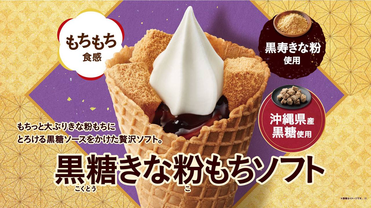 もちっと大ぶりきな粉もちに、とろける黒糖ソースをかけた贅沢ソフト「黒糖きな粉もちソフト」