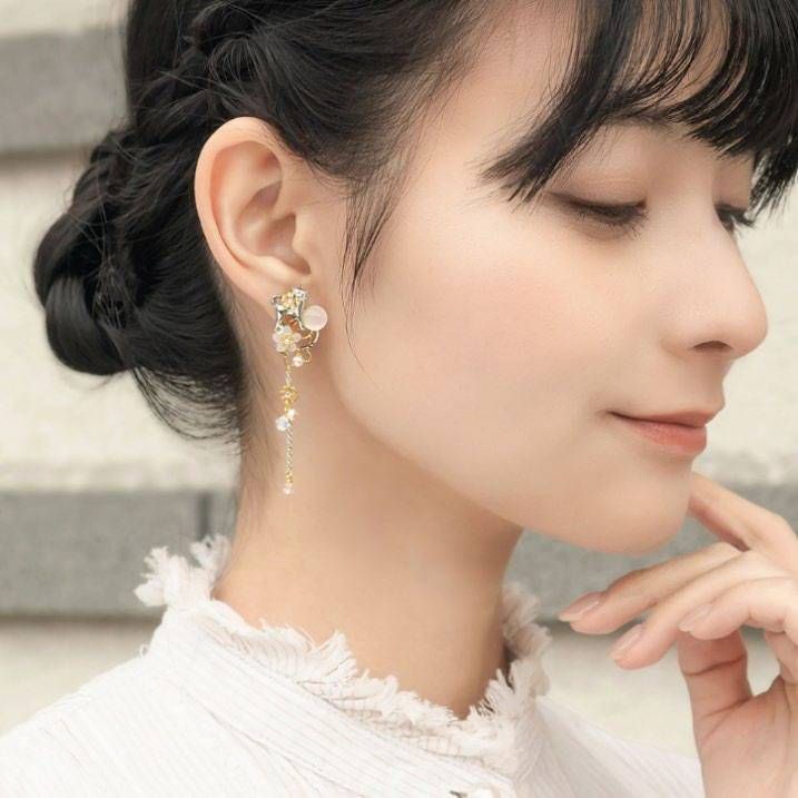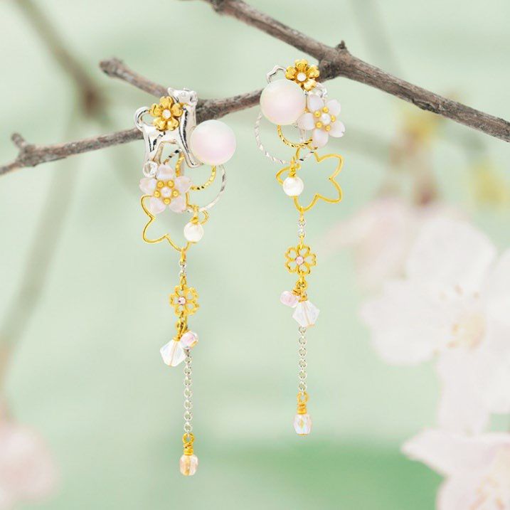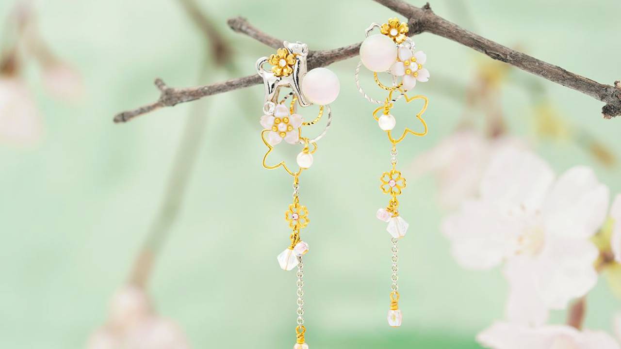日本の昔話「花咲かじいさん」をモチーフに、可愛らしい愛犬のシロと、灰から咲いた満開の美しい桜を表現したデザインのピアス、イヤリング。