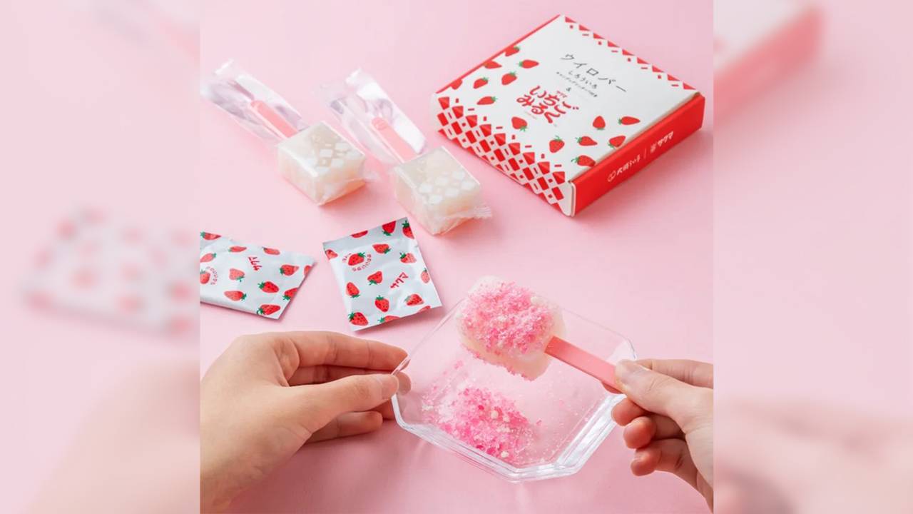 米粉と砂糖を使った蒸し菓子「大須ういろ」と、ロングセラーキャンディ、サクマ製菓の「いちごみるく」によるコラボ商品「ウイロバー いちごみるく」。