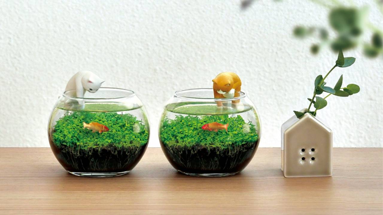 「じゃれ猫水草鉢」は、猫と金魚が織りなすワンシーンを切り取ったような情景を、水草栽培とともに楽しめるキットです。